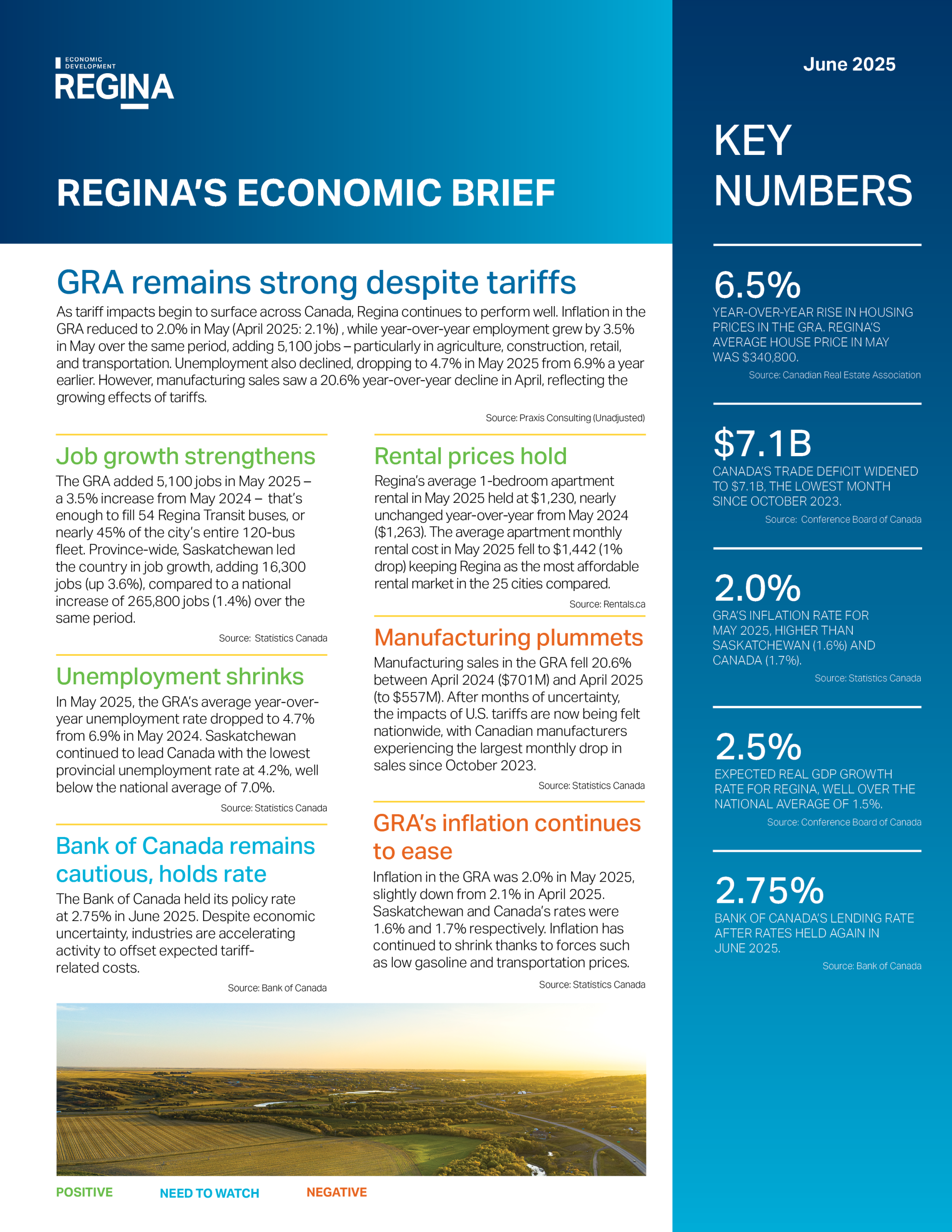 The Economic Brief and Report Card is a joint initiative between Economic Development Regina Inc., Praxis Consulting, and SJ Research Services. It provides a concise report of key economic indicators for the Greater Regina Area, updated monthly.
