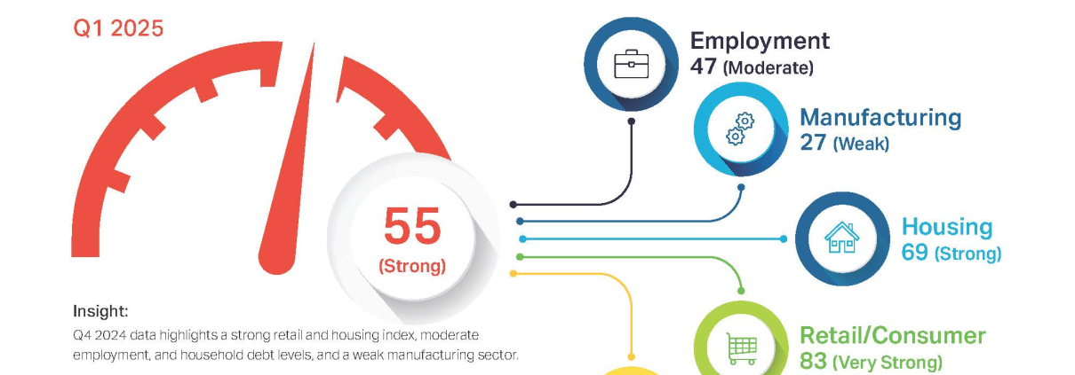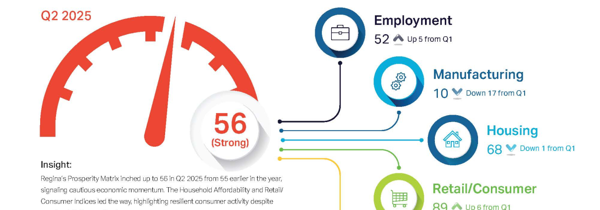 The Regina Prosperity Matrix is a unique to Regina statistical tool that measures the overall health of the GRA’s economy. This quarterly measure combines five key economic indicators, each normalized on a scale from 0 to 100, to create a composite score.