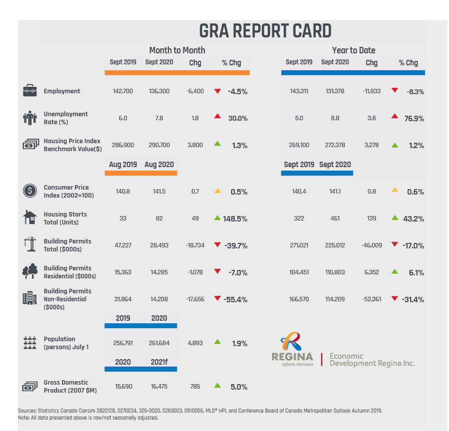 Employment is down sharply and unemployment is up in the Greater Regina Region. Pandemic related labour market contractions are expected to continue through remainder of 2020 with more layoffs/permanent furloughs. However, job losses are showing signs of slowing. Employment was down by 6,400 when comparing September 2020 to September. This represents a slowing in job losses compared to previous months: a 13,800 decline (April 2020 vs. April 2019), a decline of 20,500 (May 2020 vs. May 2019), a decline of 22,400 (June 2020 vs. June 2019), a decline of 16,200 (July 2020 vs, July 2019) and a further decline of 12,300 (August 2020 vs. August 2019). Despite the majority of indicators in decline, housing starts and residential building permits, a leading indicator of home construction, were bright spots.