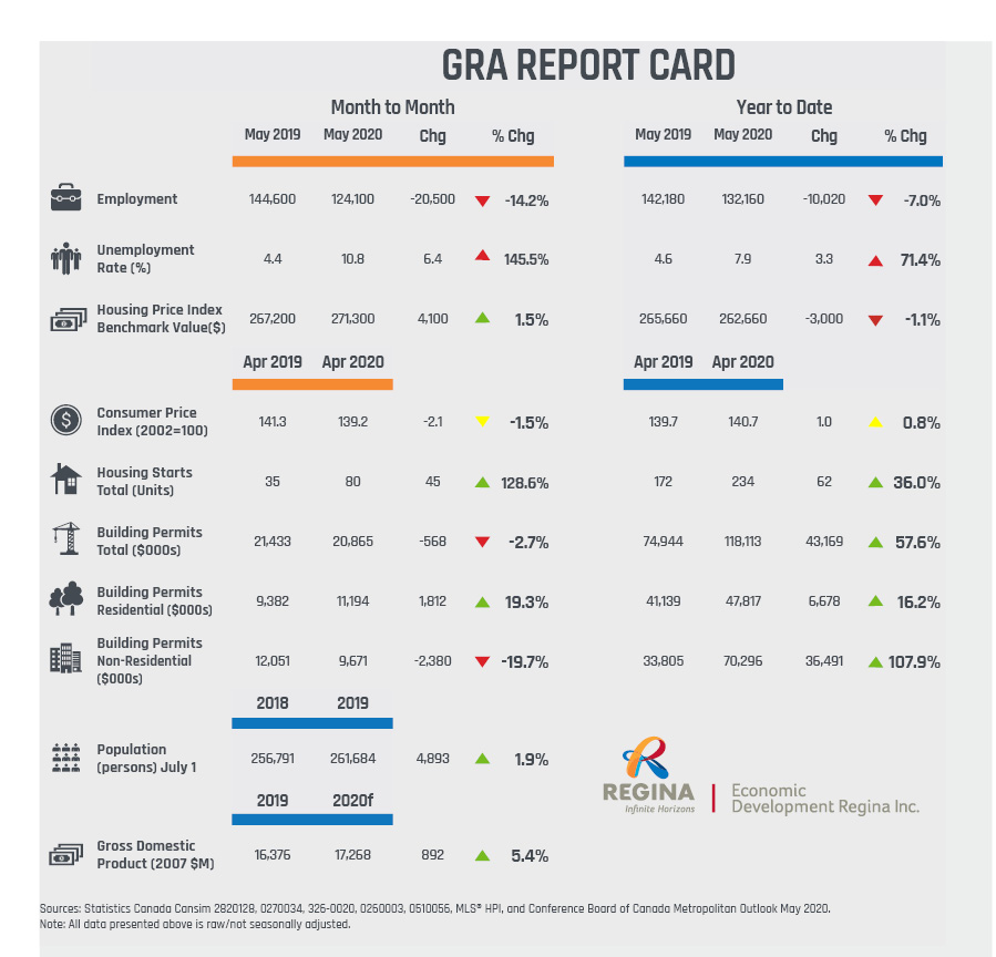 Employment is down sharply and unemployment is up in the Greater Regina Area. Pandemic related job losses are expected to continue through June 2020 with more layoffs/permanent furloughs and with more students entering a weak summer job market. Construction activity bounced back in the first 4 months of 2020 after a very weak 2019. Gains in housing starts and building permits, not reflected in the employment data.