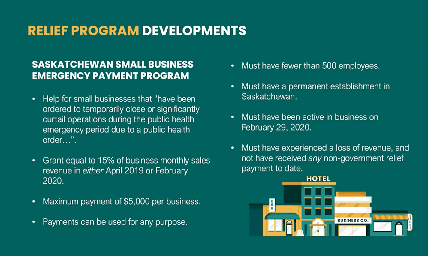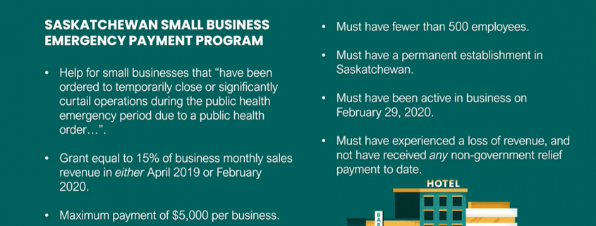 This week, the Government of Saskatchewan announced the Saskatchewan Small Business Emergency Payment Program for small businesses in the province that have been ordered to temporarily close or significantly curtail operations during the public emergency period due to a public health order to help control transmission of COVID-19. The program provides a grant of up to $5,000 for small businesses based on 15% of a business’s monthly sales revenue in either April 2019 or February 2020.