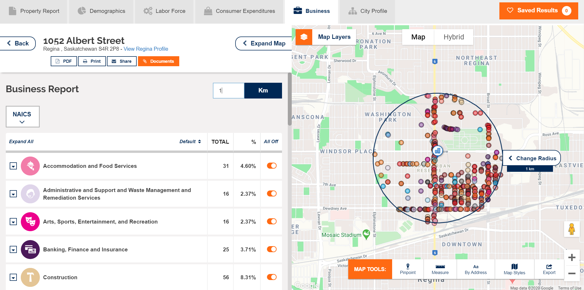 Selecting “Business” will plot all the businesses in the selected radius by category and subcategory. Select “All Off”, then toggle select categories to view specific business types. If you can’t find a business type, you can also search by NAIC (North American Industry Classification) cod. All NAIC codes can be found on the Statistics Canada website.