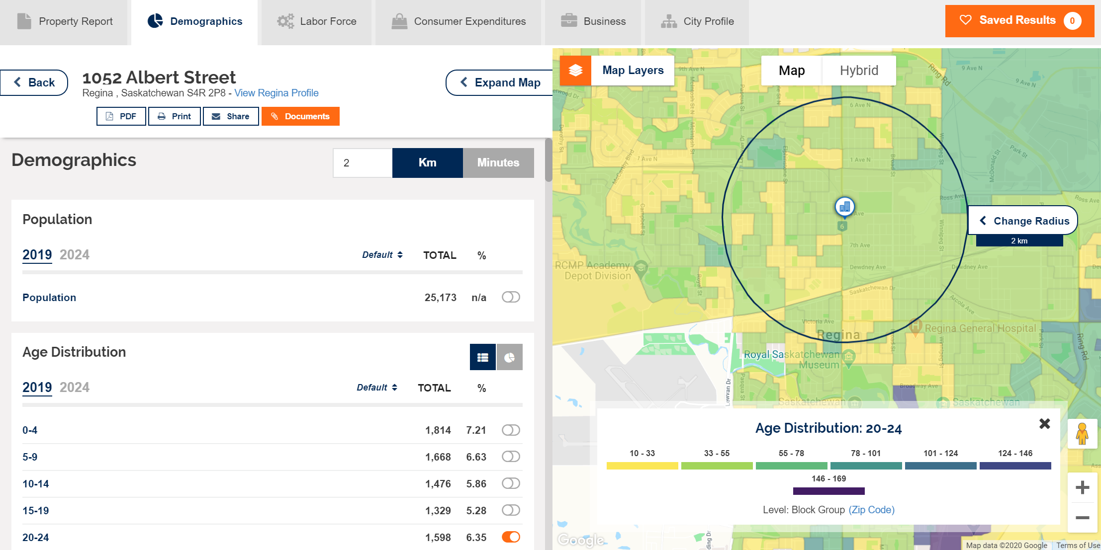 By selecting “Demographics” we can see a detailed breakdown of demographic information within a selected radius of the potential property. Current data is available for age, household income, and education status, to name a few.