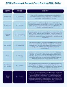 (Regina) With strong economic, employment and population growth, a stable housing market, and promising new sectors, the Greater Regina Area’s (GRA) economy is expected to achieve a solid “B+” grade for 2024, reflecting the region’s underlying strength and potential.